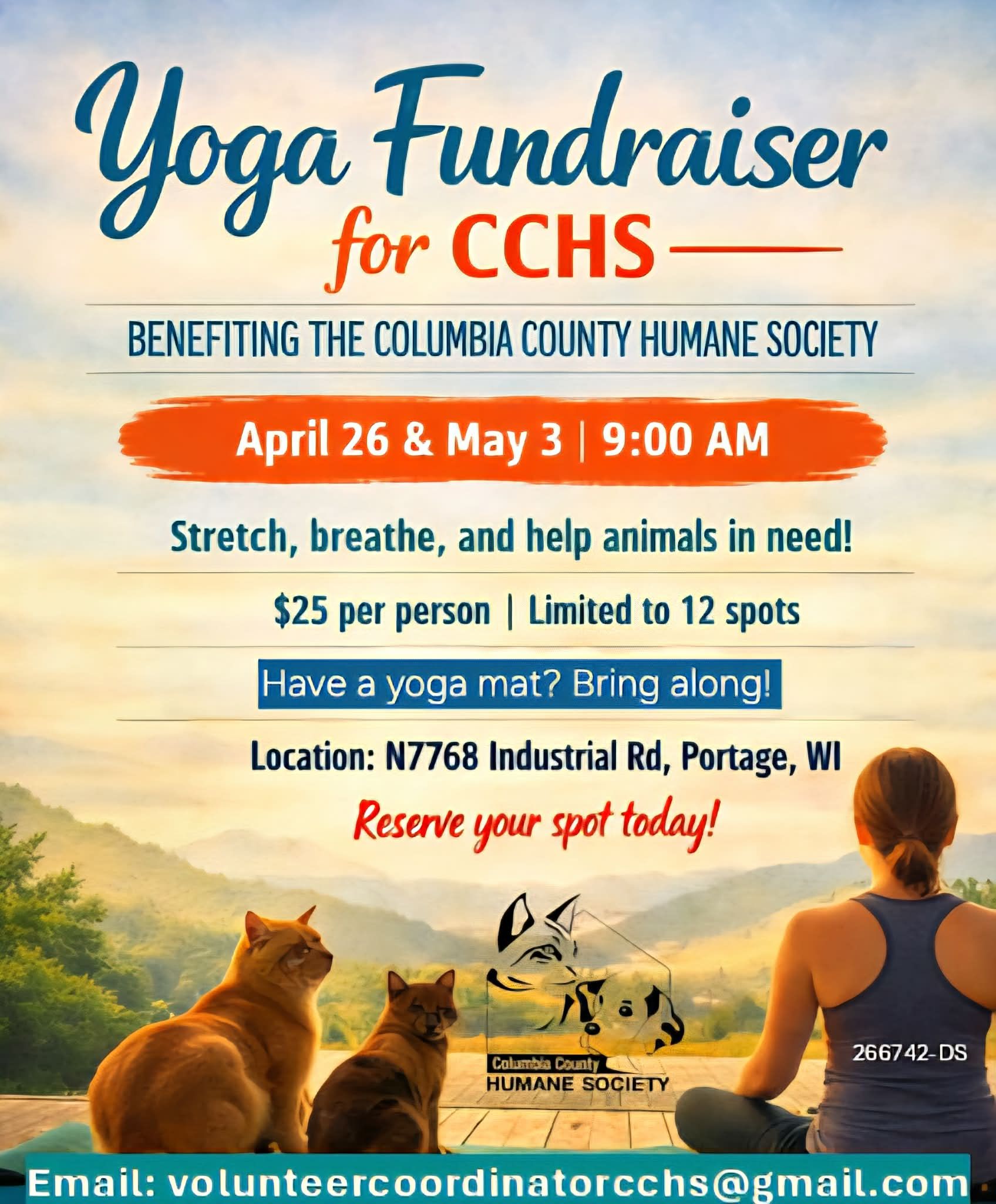 Join us for an hour of relaxing, feel‑good yoga at CCHS — all to support the animals in our care. Stretch, breathe, and help pets in need while enjoying a peaceful start to your morning. Dates: April 26 & May 3
